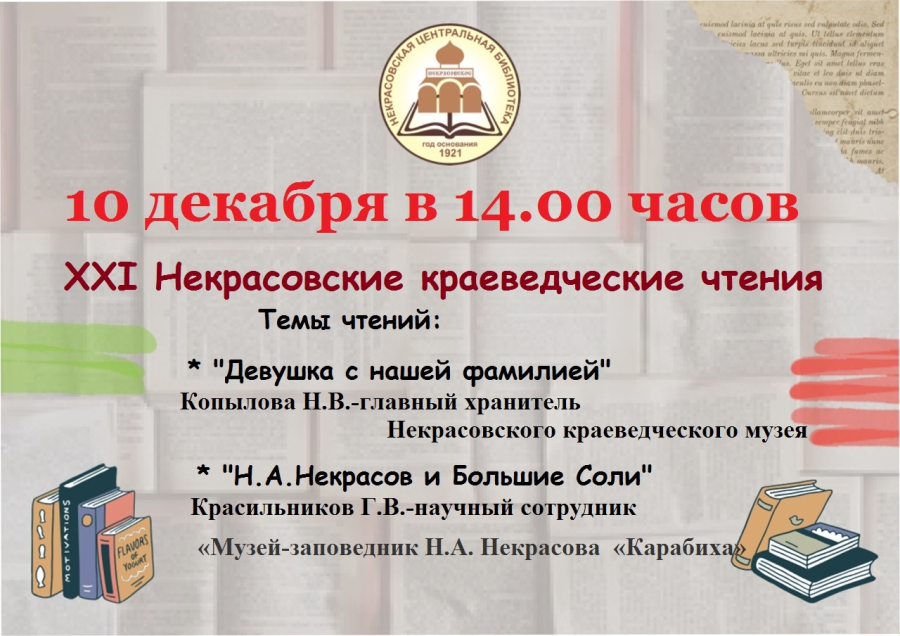 В этом году мы приглашаем вас на XXI Некрасовские краеведческие чтения. Это уже 21-я по счету встреча, посвященная изучению и сохранению истории, культуры и природы нашего родного края.