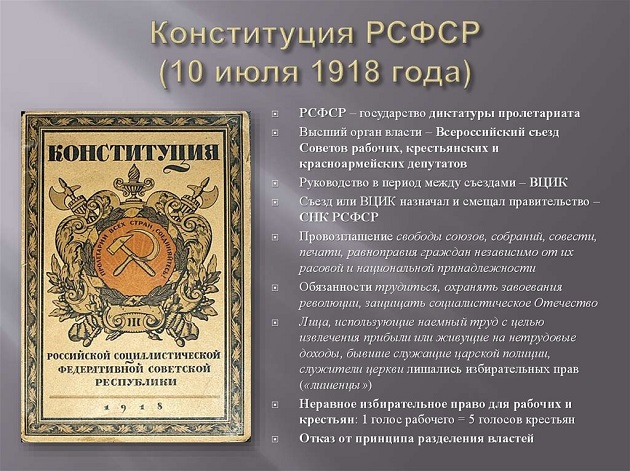 Первая конституция Российской Федерации (РСФСР) была принята V Всероссийским съездом Советов на заседании 10 июля 1918 года как Конституция (Основной Закон) РСФСР. Конституция 1918 года закрепила диктатуру пролетариата. Лица, жившие на нетрудовые доходы или использовавшие наемный труд, были лишены политических прав.