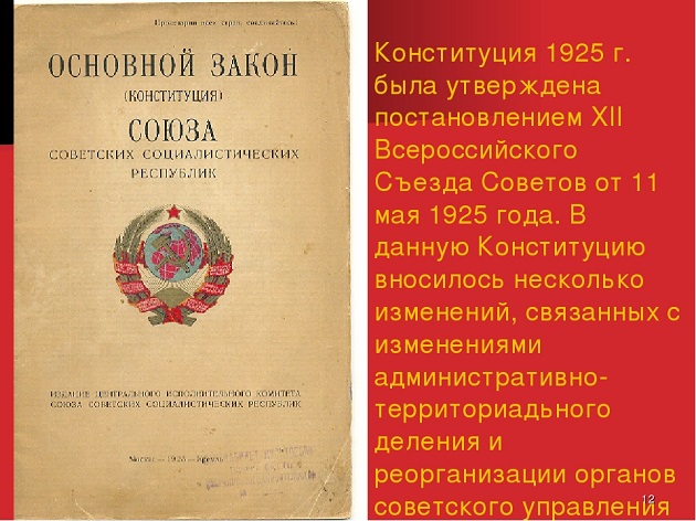 Утверждена Постановлением XII Всероссийского Съезда Советов от 11 мая 1925 года «Об Утверждении Конституции (Основного Закона) РСФСР». Её принятие обусловливалось вхождением РСФСР в состав новообразованного Союза ССР и приведением российского законодательства в соответствие союзному.